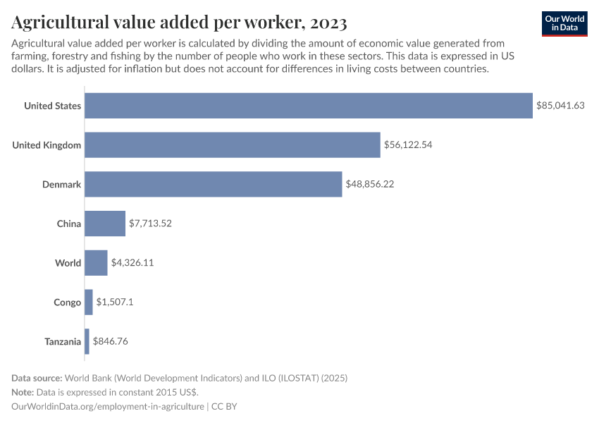 We see just how low the productivity is in the chart which compares the amount of agricultural ‘value added’ per person working in agriculture.