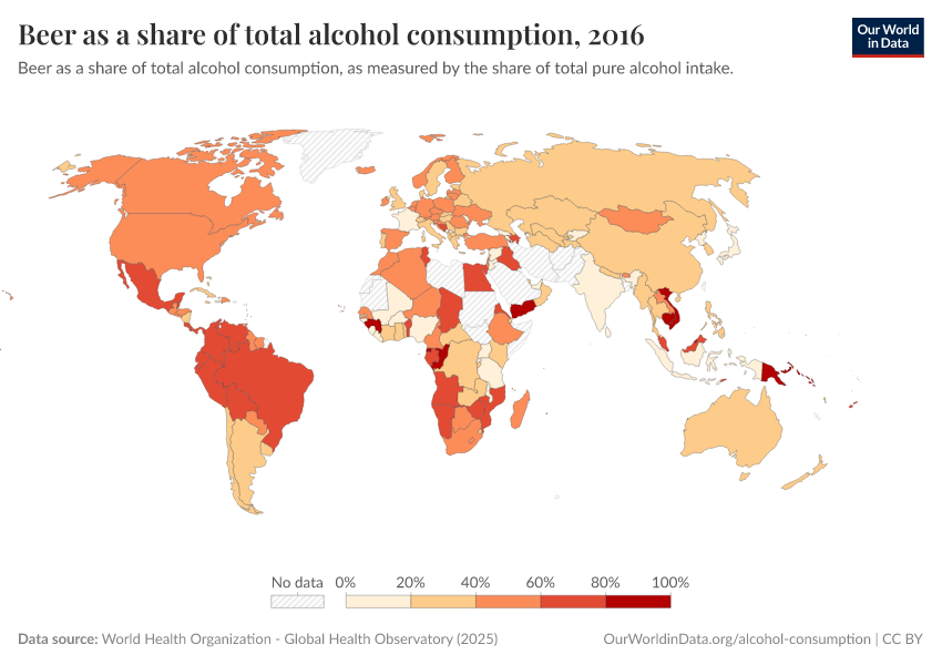 The first map shows this in terms of spirits as a share of total alcohol consumption. In many Asian countries, spirits account for most of total alcohol consumption.