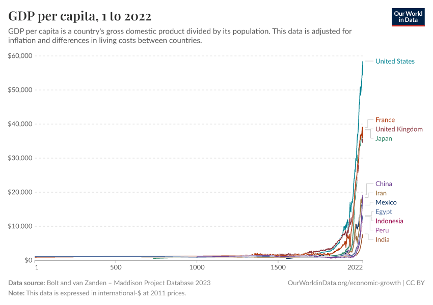 Reconstructions of living conditions over the long-run suggest that when Malthus wrote these words in 1789, he was right about the past. As the visualization here shows, GDP per capita — the average income of people — had remained extremely low.