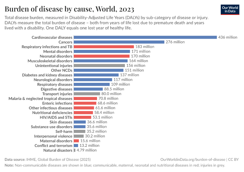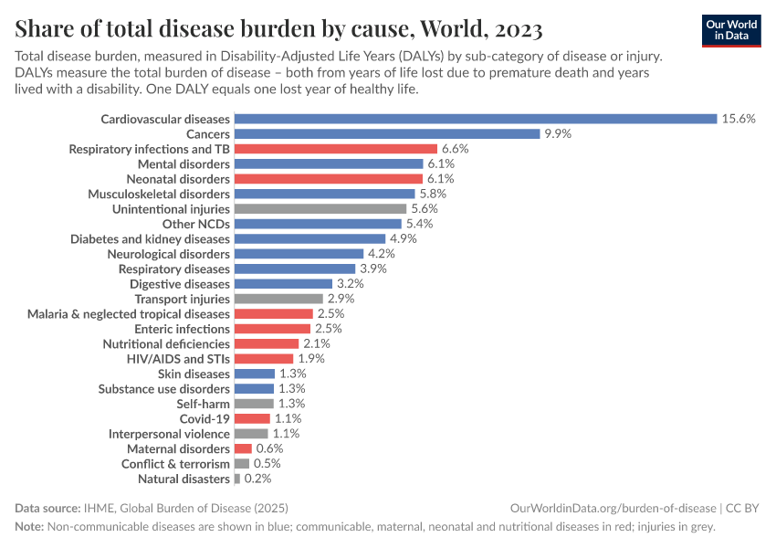 At a global level, the largest disease burden in 2019 comes from cardiovascular diseases. This is followed by cancers, neonatal disorders, musculoskeletal disorders, respiratory infections, and mental and substance use disorders.