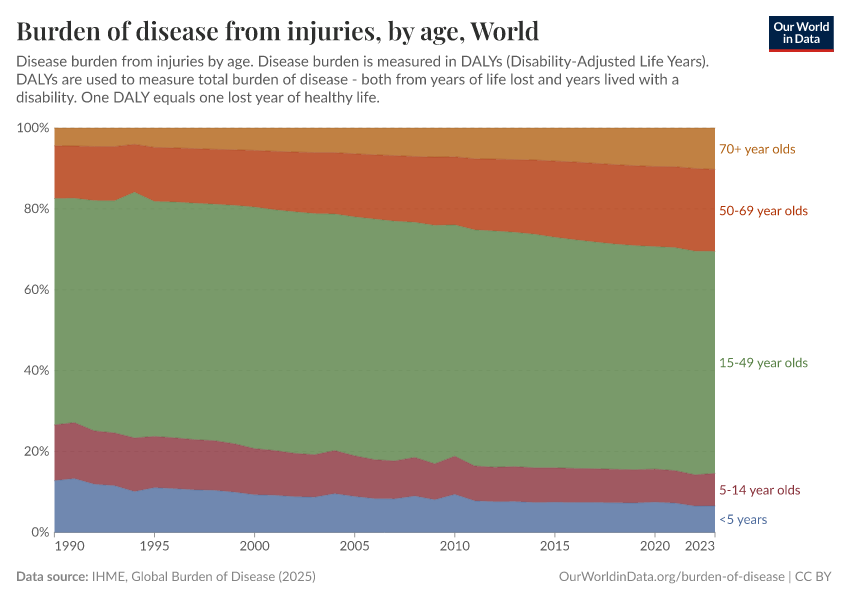 The charts here provide an overview of the burden of disease from injuries.