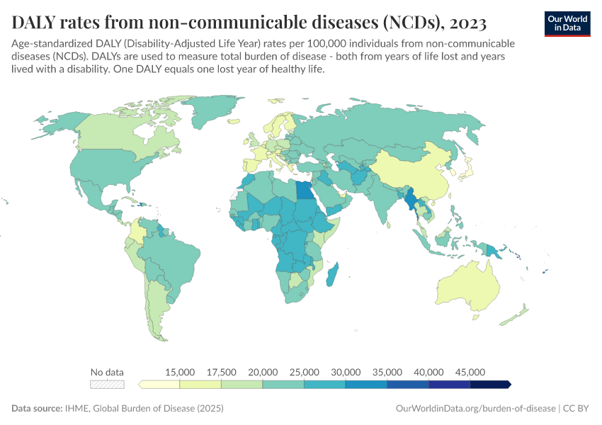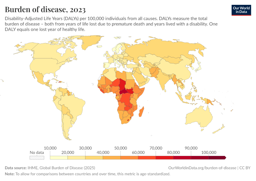 This map shows the annual rate of DALYs per 100,000 people in the population. It is thereby measuring the distribution of the burden of both mortality and morbidity around the world.