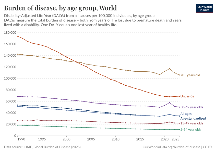As you can see, rates of disease burden remain highest among the youngest and oldest in society. They have, however, seen the most notable declines in recent decades.