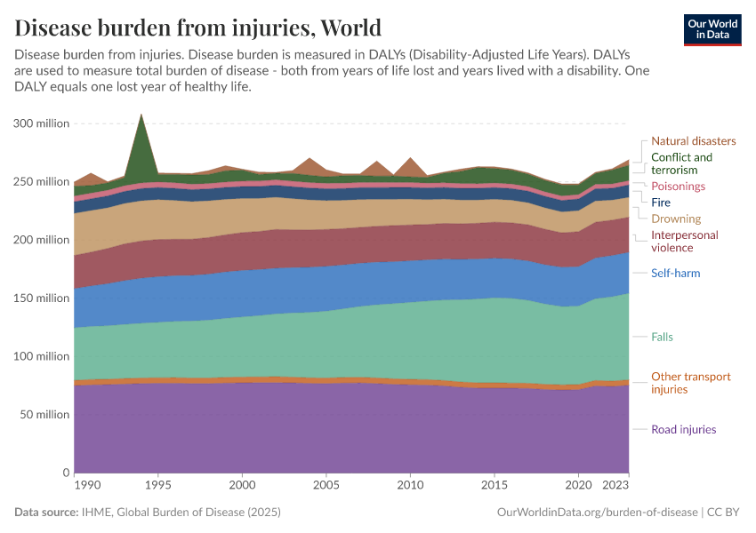 The chart shows the burden of disease from injuries, broken down by type. Road accidents, interpersonal violence, and self-harm contribute large shares to the burden of disease.