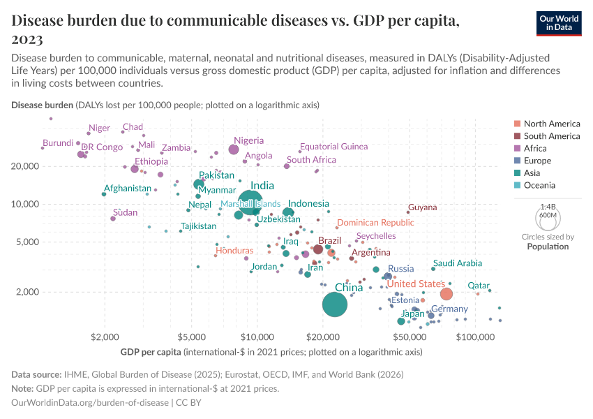 The correlation between both measures is apparent: both DALY loss rates and the total share from communicable diseases tend to decline with increasing incomes. But despite this correlation, Sterck et al. 20171 find that GNI is not a significant predictor of health outcomes once other factors are controlled for.