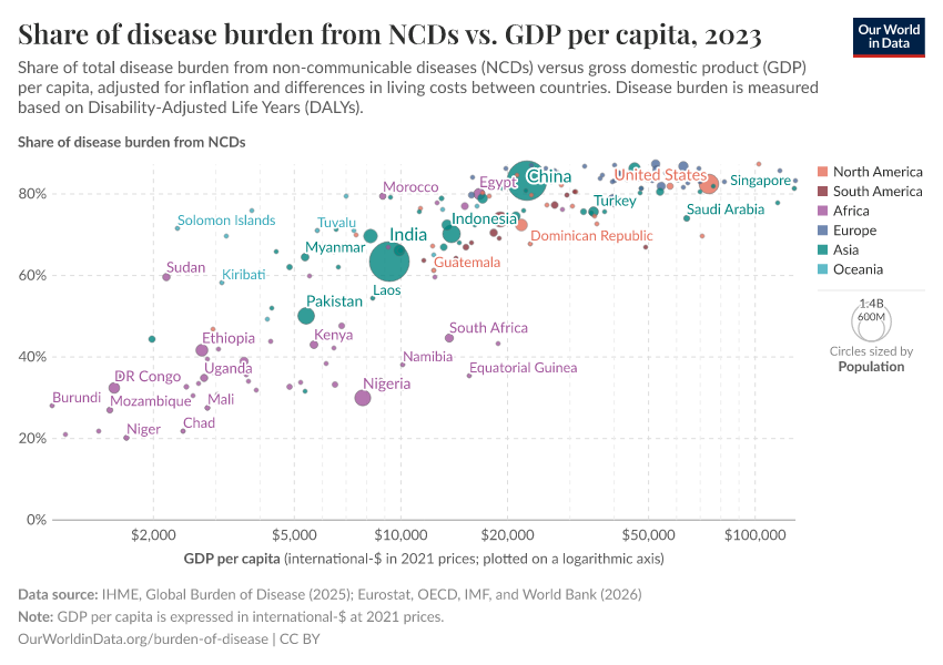 However, NCDs also constitute a higher share of disease burden at higher incomes. This is because communicable diseases decline more greatly with income than non-communicable diseases do.