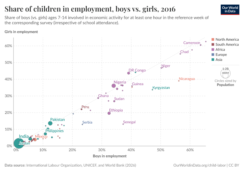 In the majority of countries boys are more likely than girls to be engaged in economic activity. The visualization here presents the incidence of child employment for boys vs. girls by country, according to estimates made available by the World Bank.