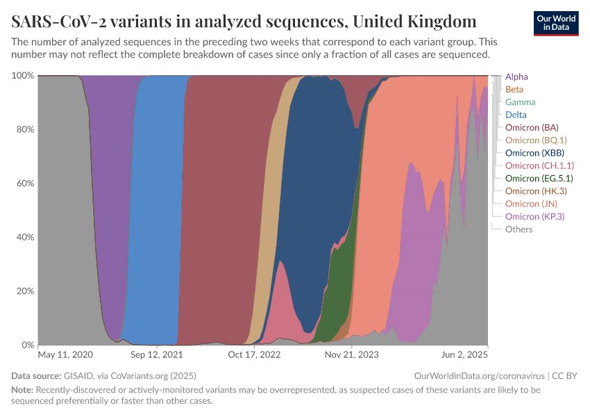 We obtain the share of cases of each variant by dividing the number of sequences labeled for that variant by the total number of sequences. Since only a fraction of all cases have their genome sequenced, this share may not reflect the complete breakdown of cases.