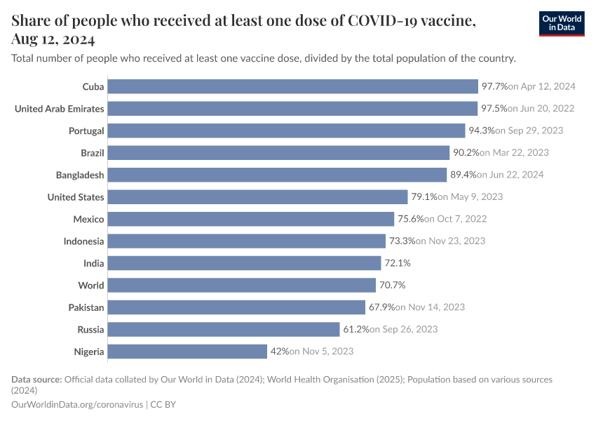 Edouard Mathieu, Hannah Ritchie, Lucas Rodés-Guirao, Cameron Appel, Daniel Gavrilov, Charlie Giattino, Joe Hasell, Bobbie Macdonald, Saloni Dattani, Diana Beltekian, Esteban Ortiz-Ospina, and Max Roser (2020) - “Coronavirus (COVID-19) Vaccinations” Published online at OurWorldinData.org. Retrieved from: 'https://search-sync-local-query.owid.pages.dev/covid-vaccinations' [Online Resource]BibTeX citation