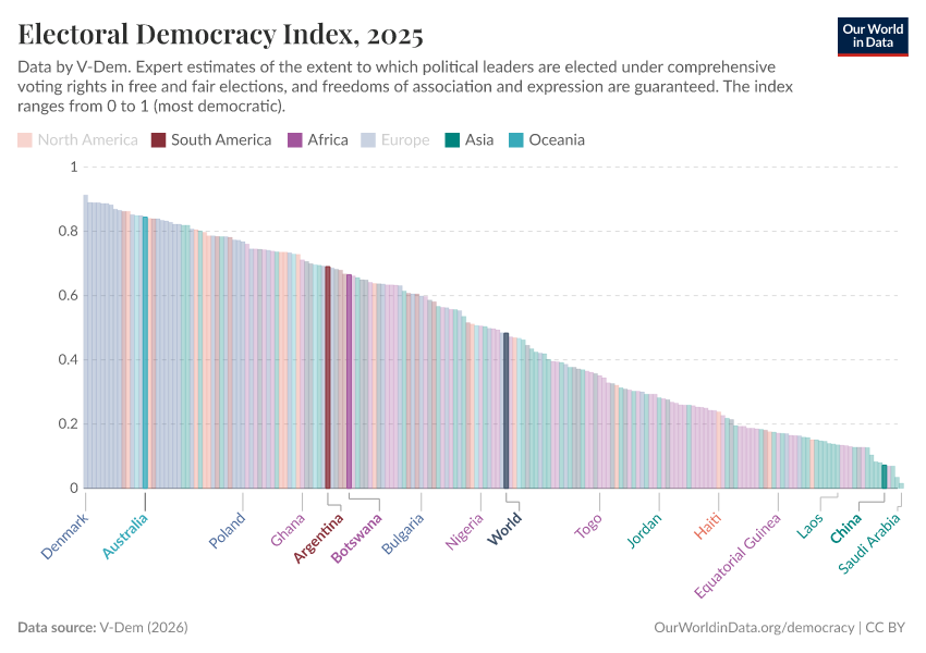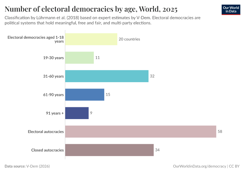 On this page, you can find data, visualizations, and writing on how democracy has spread across countries, how it differs between them, and whether we are moving towards a more democratic world.