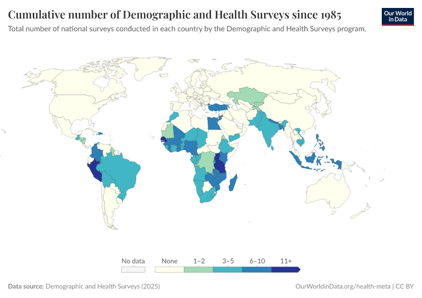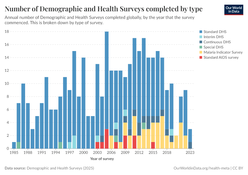 Saloni Dattani (2025) - “The Demographic and Health Surveys brought crucial data for more than 90 countries — without them, we risk darkness” Published online at OurWorldinData.org. Retrieved from: 'https://search-sync-local-query.owid.pages.dev/demographic-health-surveys-risk' [Online Resource]BibTeX citation