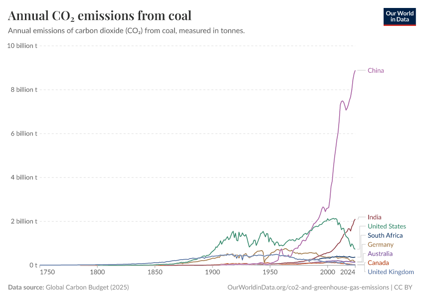 Emissions from coal have since shifted elsewhere: in recent decades we have seen a rapid rise in emissions from industrializing economies such as China, India, and South Africa.