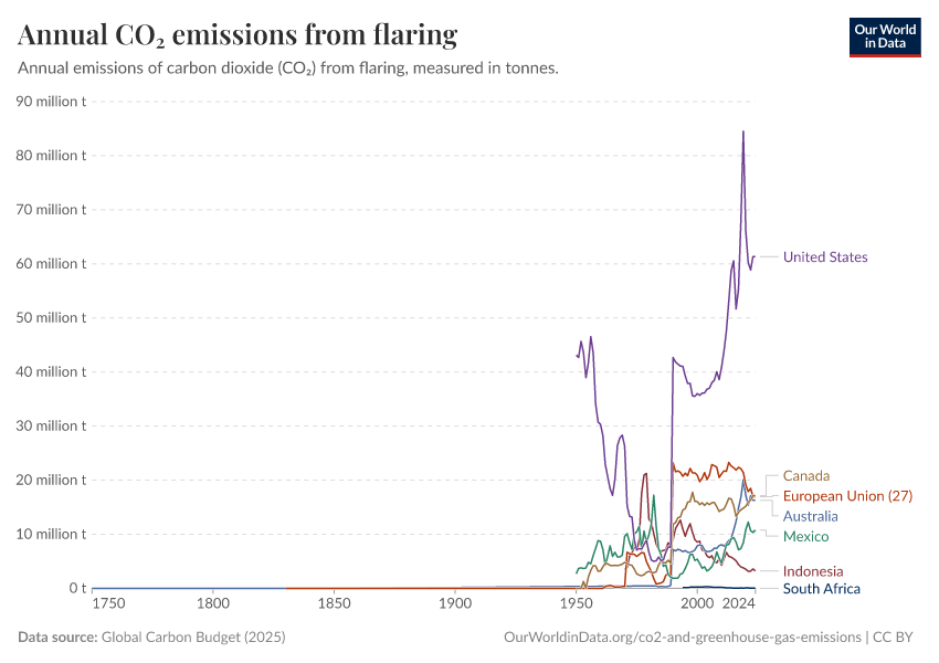 This interactive chart shows annual emissions from gas flaring by country, over time.