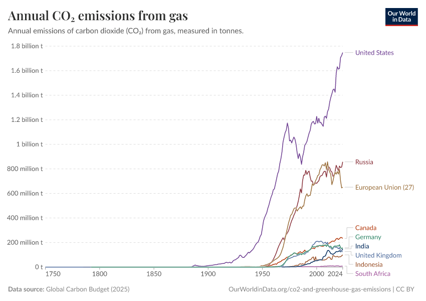 This interactive chart shows annual emissions from gas by country, over time.
