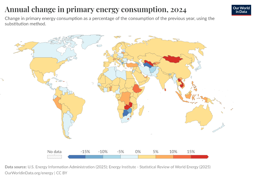 This interactive chart shows the annual growth rate of energy consumption. Positive values indicate a country's energy consumption was higher than the previous year. Negative values indicate its energy consumption was lower than the previous year.