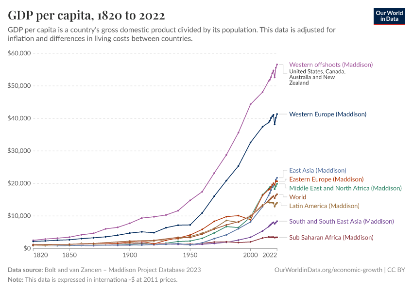 It is also worth keeping in mind that this change has happened while the world population increased 5-fold. Had total global production not increased, the GDP per capita would have declined 5-fold.