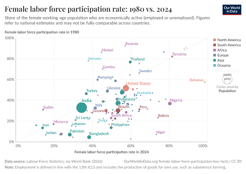 The chart here shows this, comparing national estimates of female participation rates in 1980 (vertical axis) and the most recent year (horizontal axis).6