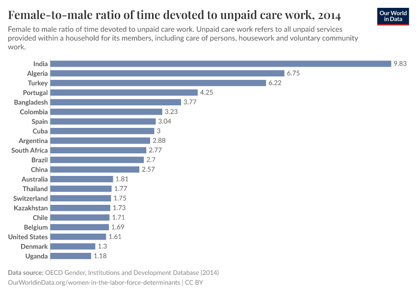 Yet there are clear differences when it comes to the magnitude of these gender gaps. In some countries, women work around 70% more than men in unpaid care activities at home. In others, women work four or six times more than men on these activities.