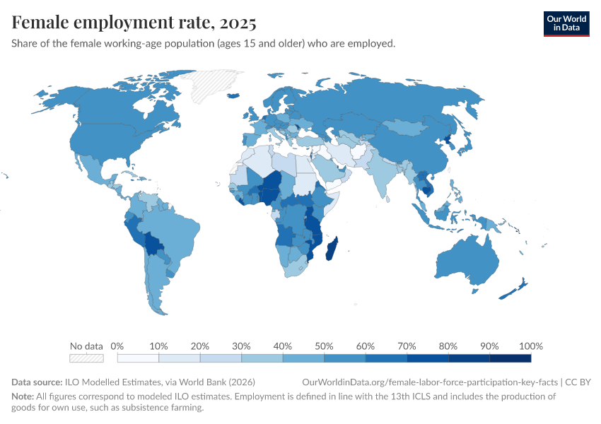 The map here provides a picture of how men and women compare today in terms of participation in labor markets, country by country. Shown is the female-to-male ratio in labor force participation rates (expressed in percent). These figures show estimates from the International Labor Organization (ILO). These are “modeled estimates” in the sense that the ILO produces them after harmonizing various data sources to improve comparability across countries.