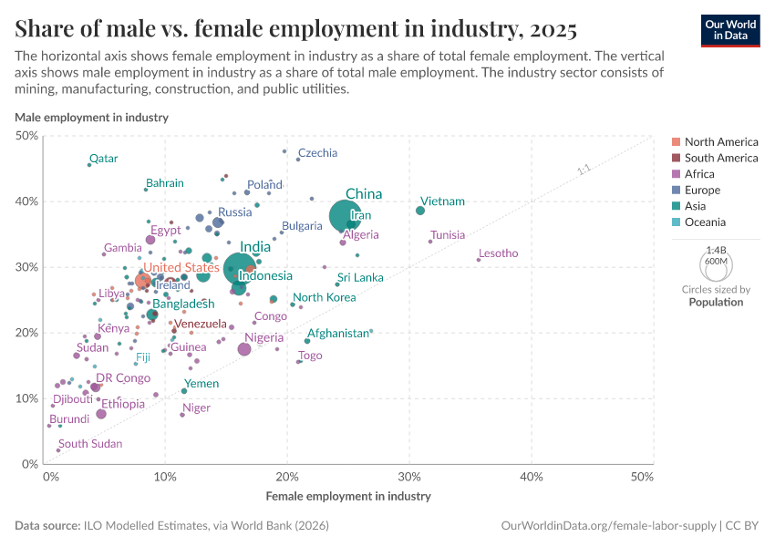 All over the world men are more likely to work in industry than women (most countries lie below the diagonal line). And women tend to work more often than men in services.