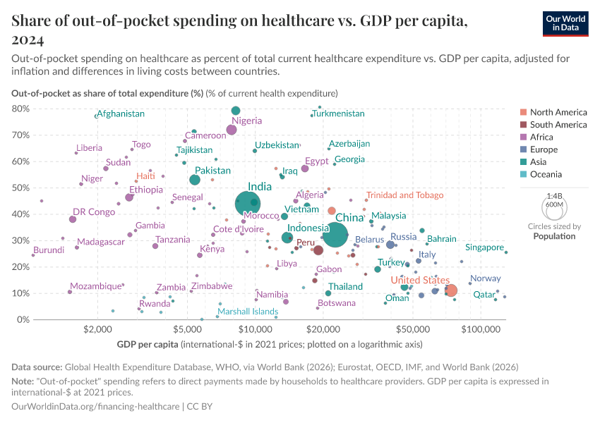 In countries where healthcare is principally financed through public funds, out-of-pocket spending is typically low; this is natural since in these countries there is essentially universal coverage through public insurance (e.g. Cuba, UK, Sweden, France). By the same logic, out-of-pocket spending is also low in countries where healthcare is largely financed through private funds in the form of private voluntary insurance (e.g. US). It is in countries with low public healthcare spending and low private voluntary insurance that out-of-pocket expenditure is high (e.g. India, Afghanistan, Sudan).