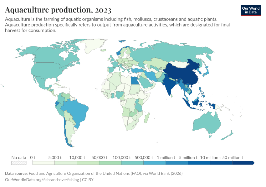 The two charts here show the distribution of fish farming (also known as ‘aquaculture’) by country. First is the global distribution, as shown on the map. Second, as in the regional breakdown, you can also add and compare countries using the “Edit countries and regions” button.