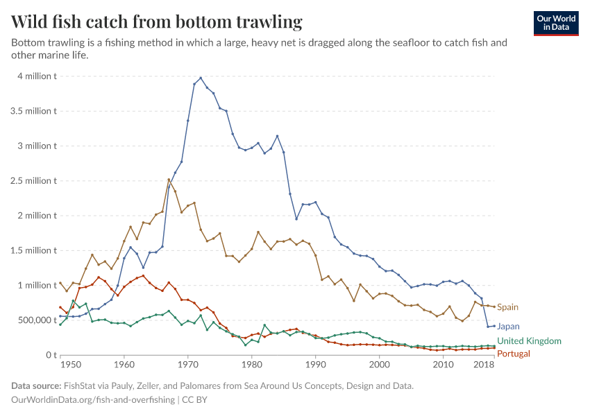 In contrast, bottom trawling is becoming less common across Europe. In many countries – such as the UK, Spain, and Portugal – bottom trawling was intense throughout the 1950s, 60s, and 70s but has since declined significantly. That has been partly driven by efforts to reduce overfishing and allow fish stocks to rebuild. In addition, the European Commission banned bottom trawling in deep waters – those below 800m in depth – in 2016.