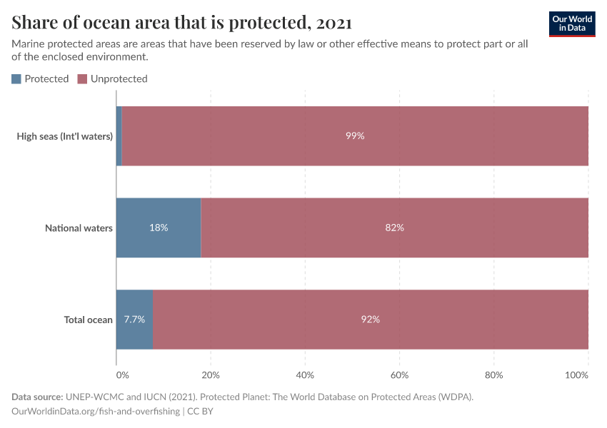 Here, we have to differentiate between national territorial waters – that is, parts of the ocean typically closer to coastlines that countries have national rights over – and international waters (also called the ‘high seas’) that do not belong to any single country. In the chart, we see the amount in each zone that is protected and unprotected.41