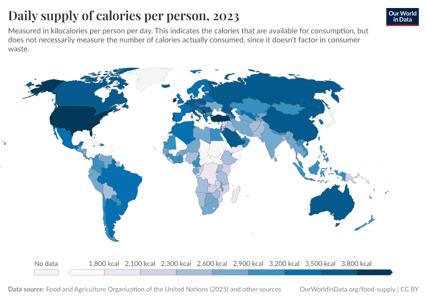 Max Roser, Hannah Ritchie, and Pablo Rosado (2013) - “Food Supply” Published online at OurWorldinData.org. Retrieved from: 'https://search-sync-local-query.owid.pages.dev/food-supply' [Online Resource]BibTeX citation