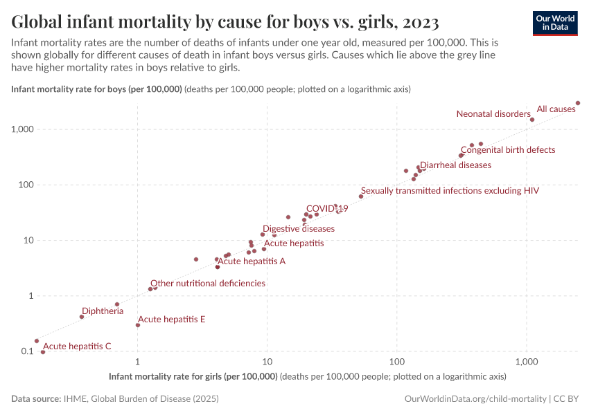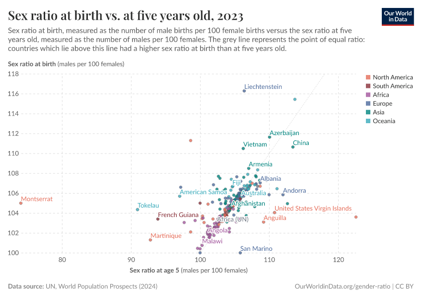 The grey line here represents parity: where countries have the same sex ratio among five-year-olds as the ratio among newborns. As we see, many countries are found slightly above this line, which means the sex ratio for newborns is higher than for 5-year-olds.