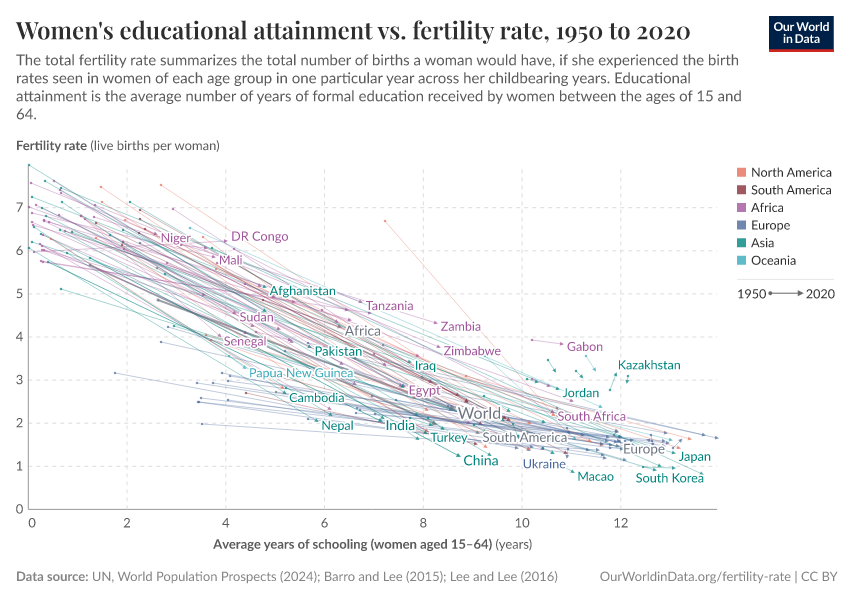 Have a look at Iran — in 1950, when Iranian women had on average only a third of a year of schooling, the fertility rate was around 7 children per woman. By 2020, when Iranian women had on average nine years of schooling, the fertility rate was below two (yes, the fertility rate in Iran is now similar to the figure in the US).