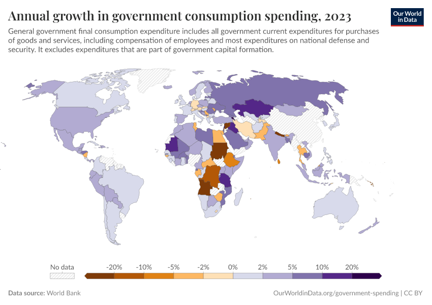 “Data Page: Annual growth in government consumption spending”. Our World in Data (2026). Data adapted from World Bank. Retrieved from https://search-sync-local-query.owid.pages.dev/grapher/annual-growth-of-general-government-final-consumption-expenditure [online resource]How to cite this data
