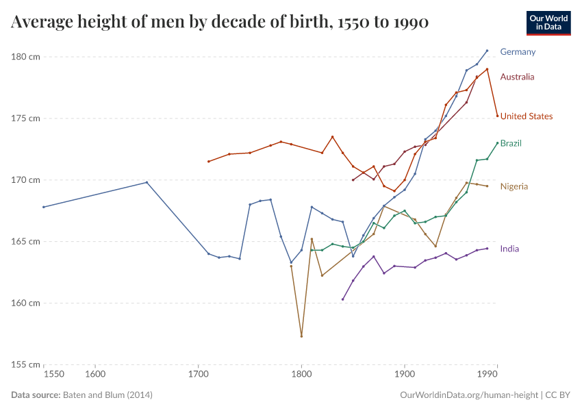 Baten and Blum (2014) – with minor processing by Our World in Data. “Average height of men by decade of birth” [dataset]. Baten and Blum, “Height” [original data]. Retrieved January 5, 2026 from https://search-sync-local-query.owid.pages.dev/grapher/average-height-of-men-for-selected-countries