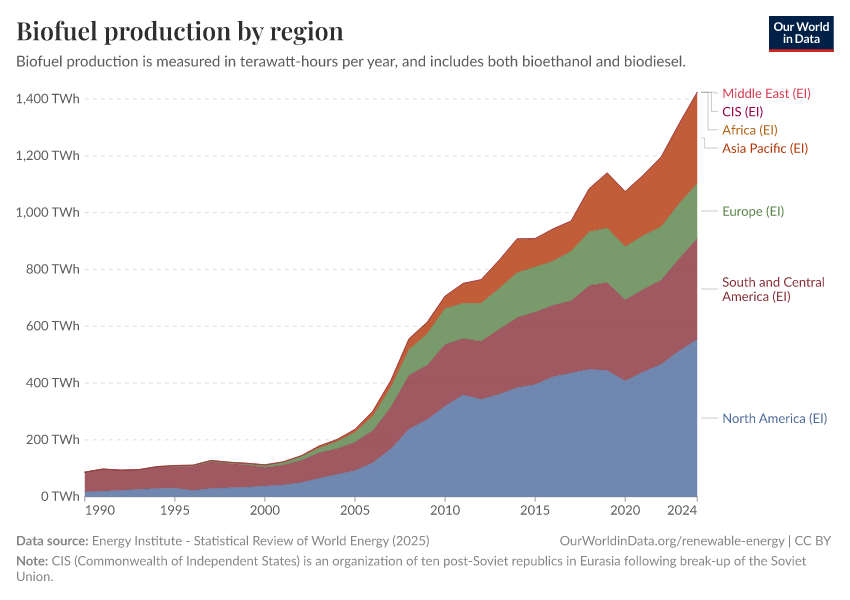 Energy Institute - Statistical Review of World Energy (2025) – with major processing by Our World in Data. “Biofuels production” [dataset]. Energy Institute, “Statistical Review of World Energy” [original data]. Retrieved January 5, 2026 from https://search-sync-local-query.owid.pages.dev/grapher/biofuels-production-by-region