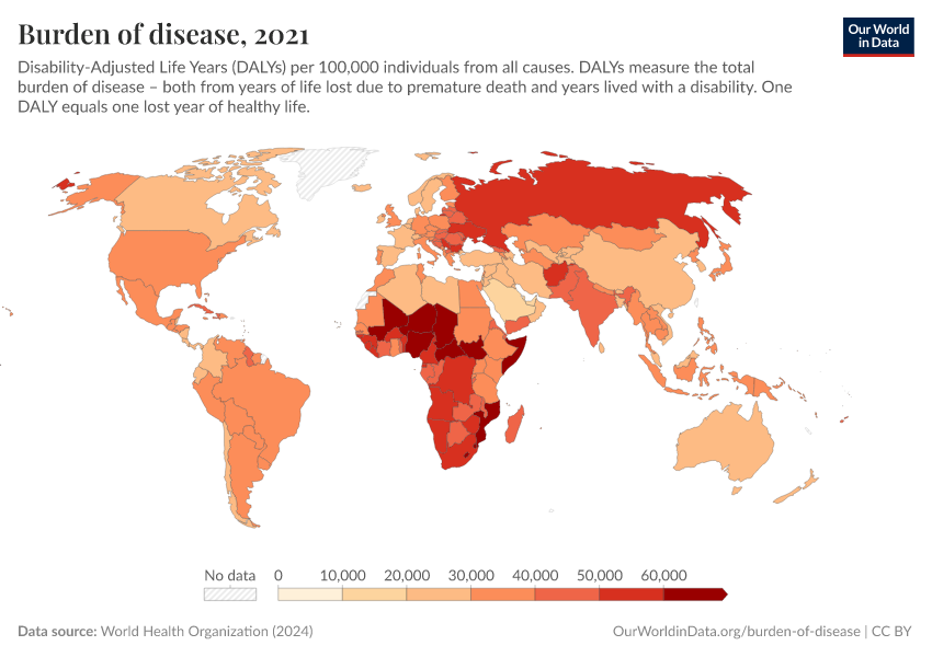 World Health Organization (2024) – with major processing by Our World in Data. “Burden of disease” [dataset]. World Health Organization, “Global Health Estimates” [original data]. Retrieved January 5, 2026 from https://search-sync-local-query.owid.pages.dev/grapher/burden-of-disease-who