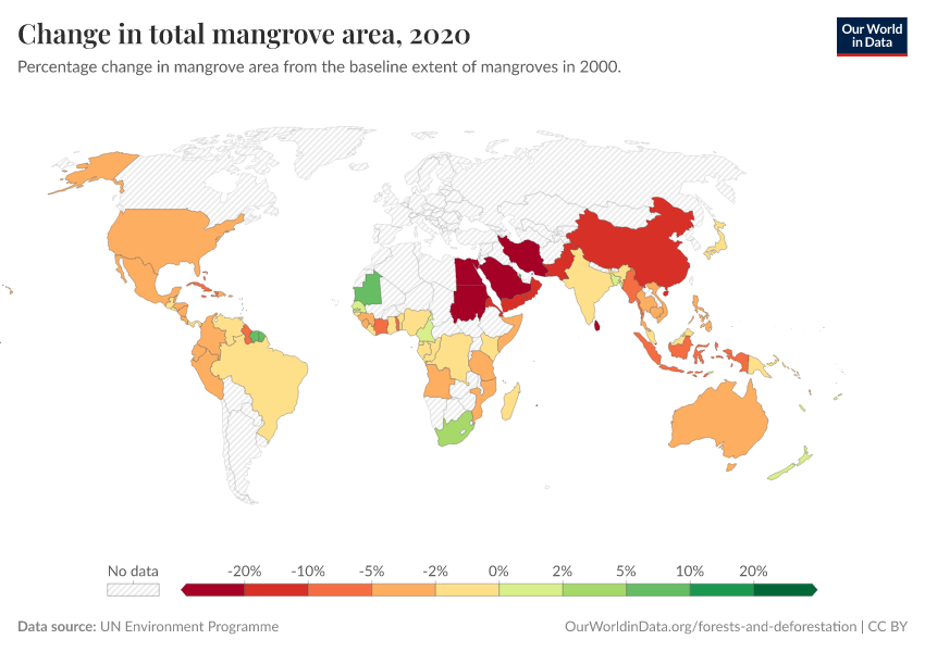 “Data Page: Change in total mangrove area”. Our World in Data (2026). Data adapted from UN Environment Programme. Retrieved from https://search-sync-local-query.owid.pages.dev/grapher/change-in-total-mangrove-area [online resource]How to cite this data