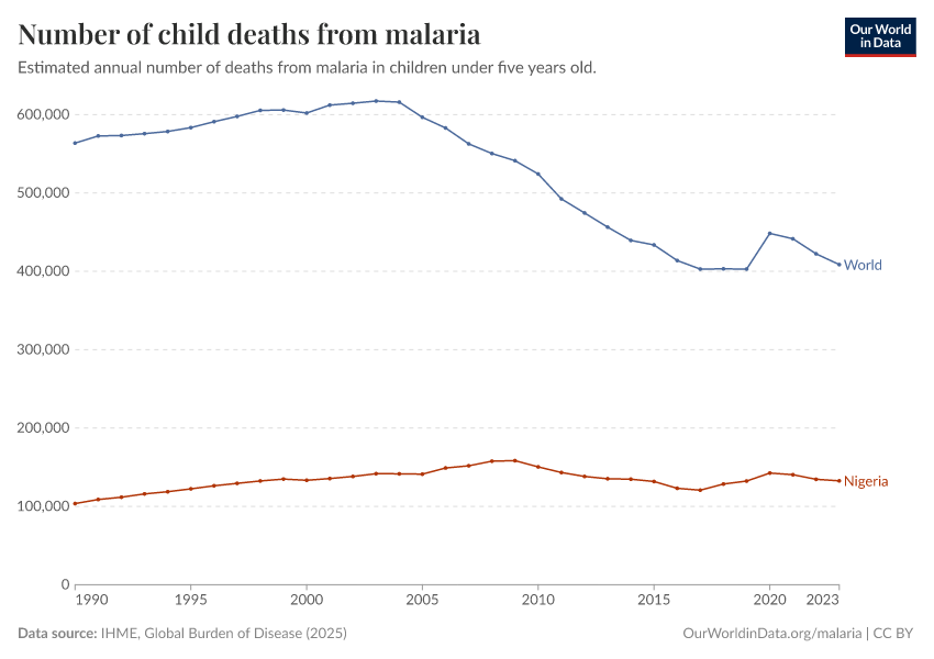IHME, Global Burden of Disease (2024) – with minor processing by Our World in Data. “Number of child deaths from malaria” [dataset]. IHME, Global Burden of Disease, “Global Burden of Disease - Deaths and DALYs” [original data]. Retrieved January 5, 2026 from https://search-sync-local-query.owid.pages.dev/grapher/child-deaths-from-malaria-number