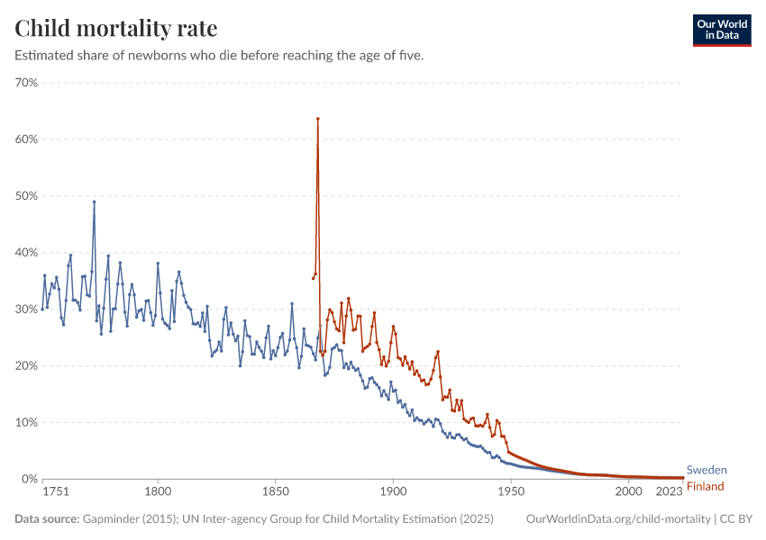 • The historical data makes clear that it doesn’t have to be this way: societies can protect their children and reduce child mortality to very low rates. For child mortality to reach low levels, many things have to go right at the same time: good healthcare, good nutrition, clean water and sanitation, maternal health, and high living standards. We can, therefore, think of child mortality as a proxy indicator of a country’s living conditions.