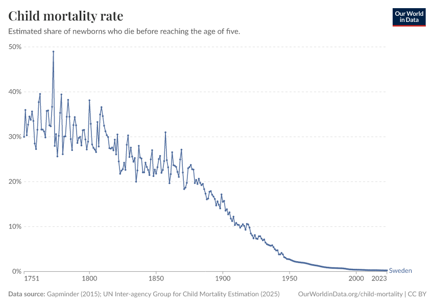 Gapminder (2015); UN Inter-agency Group for Child Mortality Estimation (2025) – processed by Our World in Data. “Child mortality rate – Gapminder; UN IGME – Long-run data” [dataset]. United Nations Inter-agency Group for Child Mortality Estimation, “United Nations Inter-agency Group for Child Mortality Estimation”; Gapminder, “Child mortality rate under age five v7”; Gapminder based on UN IGME & UN WPP, “Under-five Mortality v11”; Various sources, “Population” [original data]. Retrieved January 5, 2026 from https://search-sync-local-query.owid.pages.dev/grapher/child-mortality