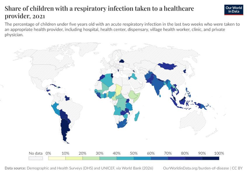 Demographic and Health Surveys (DHS) and UNICEF, via World Bank (2025) – processed by Our World in Data. “Share of children with a respiratory infection taken to a healthcare provider ” [dataset]. Demographic and Health Surveys (DHS) and UNICEF, via World Bank, “World Development Indicators 122” [original data]. Retrieved January 5, 2026 from https://search-sync-local-query.owid.pages.dev/grapher/children-treated-ari