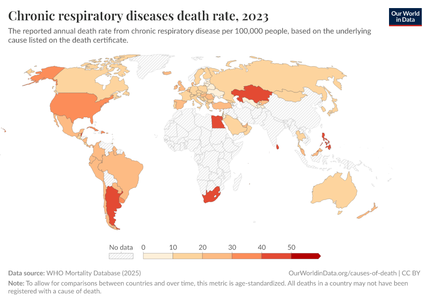 “Data Page: Chronic respiratory diseases death rate”, part of the following publication: Saloni Dattani, Fiona Spooner, Hannah Ritchie, and Max Roser (2023) - “Causes of Death”. Data adapted from WHO Mortality Database. Retrieved from https://search-sync-local-query.owid.pages.dev/grapher/chronic-respiratory-diseases-death-rate-who-mdb [online resource]How to cite this data