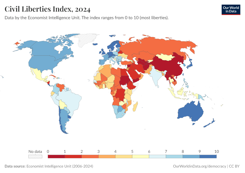 Economist Intelligence Unit (2006-2024) – processed by Our World in Data. “Civil Liberties Index” [dataset]. Economist Intelligence Unit, “Democracy Index 2021: The China challenge”; Economist Intelligence Unit, “Democracy Index 2022: Frontline democracy and the battle for Ukraine”; Economist Intelligence Unit, “Democracy Index 2023: Age of Conflict”; Economist Intelligence Unit, “Democracy Index 2024: What's wrong with representative democracy?”; Gapminder, “Democracy Index v4”; Various sources, “Population” [original data]. Retrieved January 5, 2026 from https://search-sync-local-query.owid.pages.dev/grapher/civil-liberties-index-eiu