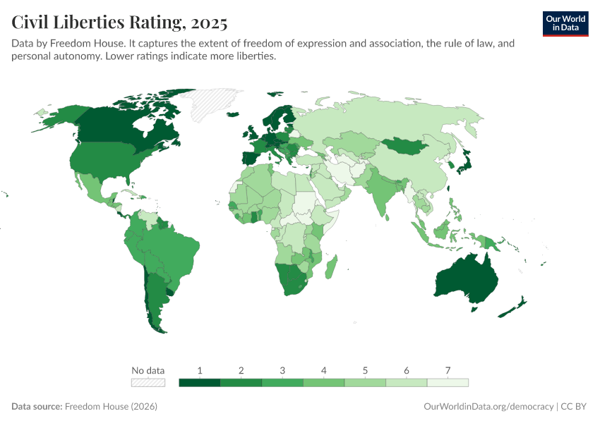 Freedom House (2025) – processed by Our World in Data. “Civil liberties rating” [dataset]. Freedom House, “Freedom in the World” [original data]. Retrieved January 5, 2026 from https://search-sync-local-query.owid.pages.dev/grapher/civil-liberties-rating-fh