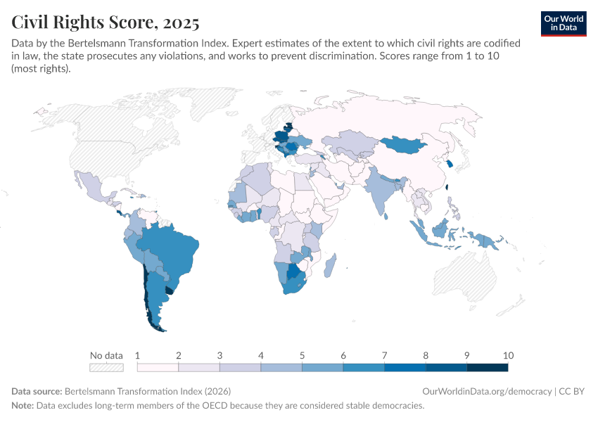 Bertelsmann Transformation Index (2024) – processed by Our World in Data. “Civil rights score” [dataset]. Bertelsmann Transformation Index, “Bertelsmann Transformation Index, Scores” [original data]. Retrieved January 5, 2026 from https://search-sync-local-query.owid.pages.dev/grapher/civil-rights-score-bti
