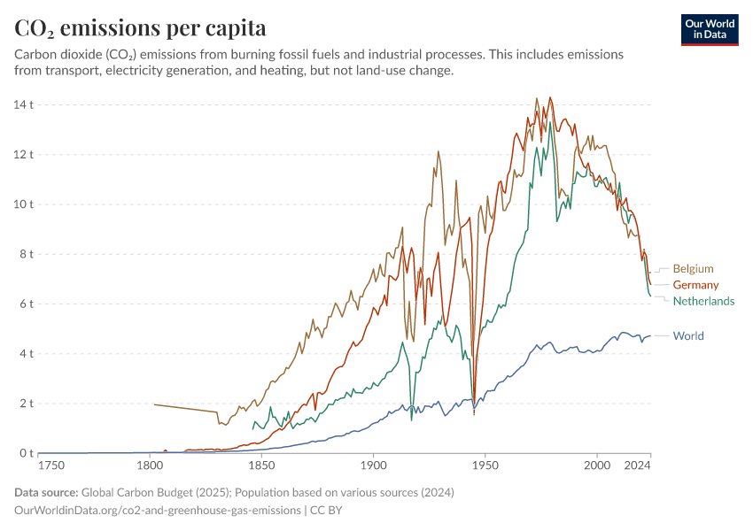 Global Carbon Budget (2025); Population based on various sources (2024) – with major processing by Our World in Data. “CO₂ emissions per capita” [dataset]. Global Carbon Project, “Global Carbon Budget v15”; Various sources, “Population” [original data]. Retrieved January 5, 2026 from https://search-sync-local-query.owid.pages.dev/grapher/co-emissions-per-capita