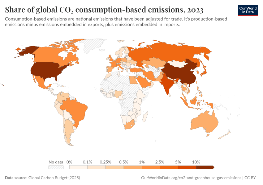 “Data Page: Share of global CO₂ consumption-based emissions”, part of the following publication: Hannah Ritchie, Pablo Rosado, and Max Roser (2023) - “CO₂ and Greenhouse Gas Emissions”. Data adapted from Global Carbon Project. Retrieved from https://search-sync-local-query.owid.pages.dev/grapher/co2-consumption-share [online resource]How to cite this data