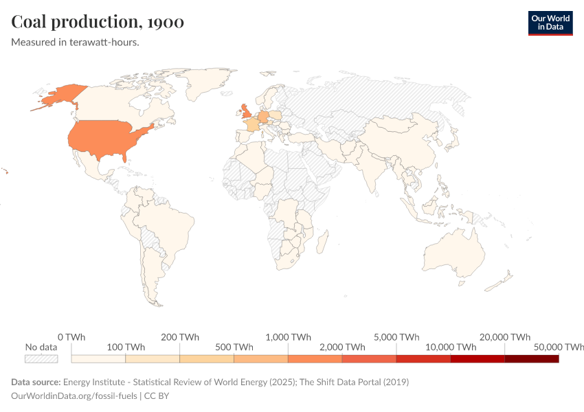 • The data is generated by combining the latest data from the Energy Institute Statistical Review of World Energy and The Shift Dataportal. The Energy Institute provides fossil fuel production data from 1965 onwards (and crude prices from 1861 onwards). The Shift Dataportal provides long-term data from 1900, but only extends to 2016. To maintain consistency with other energy data, we prioritize the Energy Institute data - meaning if they provide data for the given country and year, this data is used. Where data is not available from the Energy Institute for a given country, or pre-1965 we rely on data from The Shift Dataportal.