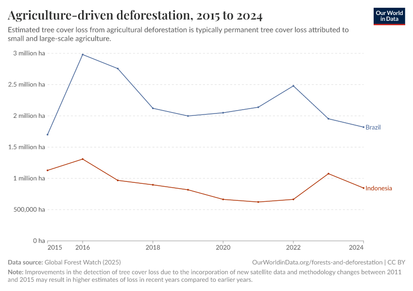 Global Forest Watch (2025) – with major processing by Our World in Data. “Agriculture-driven deforestation” [dataset]. Global Forest Watch, “Tree Cover Loss by Dominant Driver” [original data]. Retrieved January 5, 2026 from https://search-sync-local-query.owid.pages.dev/grapher/commodity-driven-deforestation