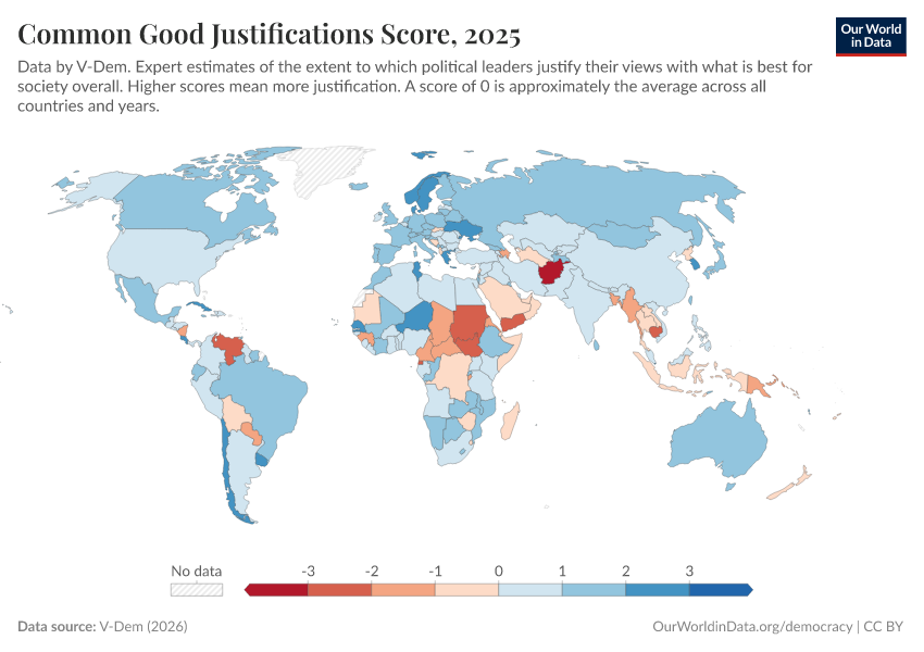 “Data Page: Common good justifications”, part of the following publication: Bastian Herre, Lucas Rodés-Guirao, and Esteban Ortiz-Ospina (2013) - “Democracy”. Data adapted from V-Dem. Retrieved from https://search-sync-local-query.owid.pages.dev/grapher/common-good-justifications-score [online resource]How to cite this data
