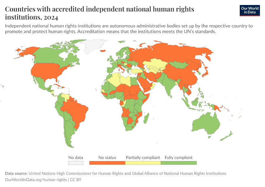 United Nations High Commissioner for Human Rights and Global Alliance of National Human Rights Institutions – processed by Our World in Data. “Countries with accredited independent national human rights institutions” [dataset]. United Nations High Commissioner for Human Rights and Global Alliance of National Human Rights Institutions, “Source: The Office of the United Nations High Commissioner for Human Rights (OHCHR) in collaboration with Global Alliance of National Human Rights Institutions (GANHRI).” [original data]. Retrieved January 5, 2026 from https://search-sync-local-query.owid.pages.dev/grapher/countries-with-independent-national-human-rights-institution